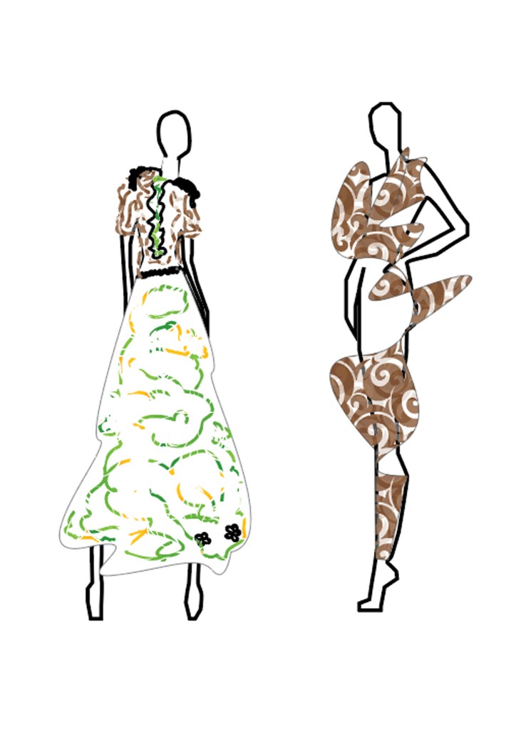 After drawing the figures that I want to use as my sketch models, I draw some garments using the pen tools and the selection tools, experimenting with different shapes and colours. The garments that I first created were very experimental as I was just getting used to the tools, adapting myself to the new skills that I had learned.